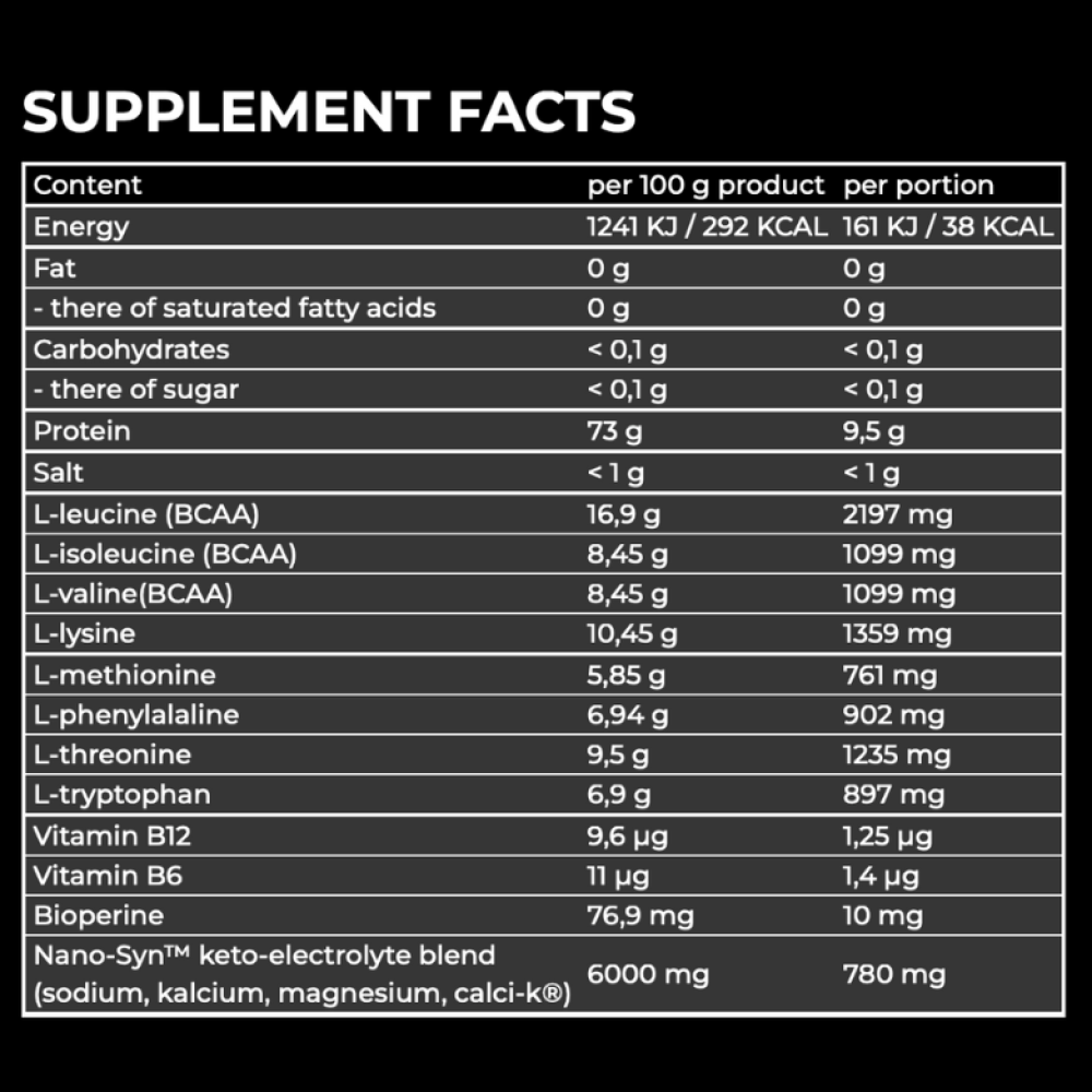 يحتوي المنتج على 9.5 غرام من الأحماض الأمينية الأساسية، بما في ذلك:
